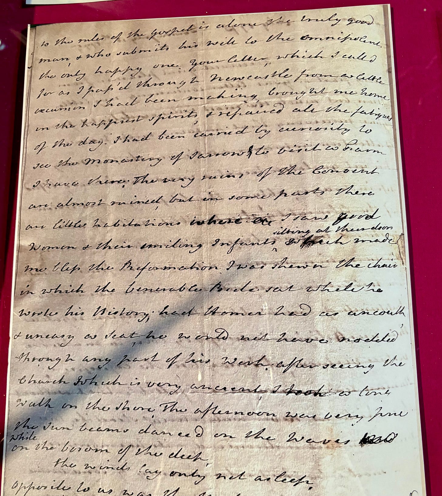 ... I had been carried by curiosity to see the Monastery of Jarrow & to visit a Farm I have there. The very ruins of the Convent are almost ruined, but in some parts, there are little habitations wherein I saw good women & their smiling infants sitting at their doors which made me bless the Reformation. I was shewn the chair in which the venerable Bede sat while he wrote his History; had Homer had as uncouth & uneasy a seat, he would not have nodded through any part of his work....