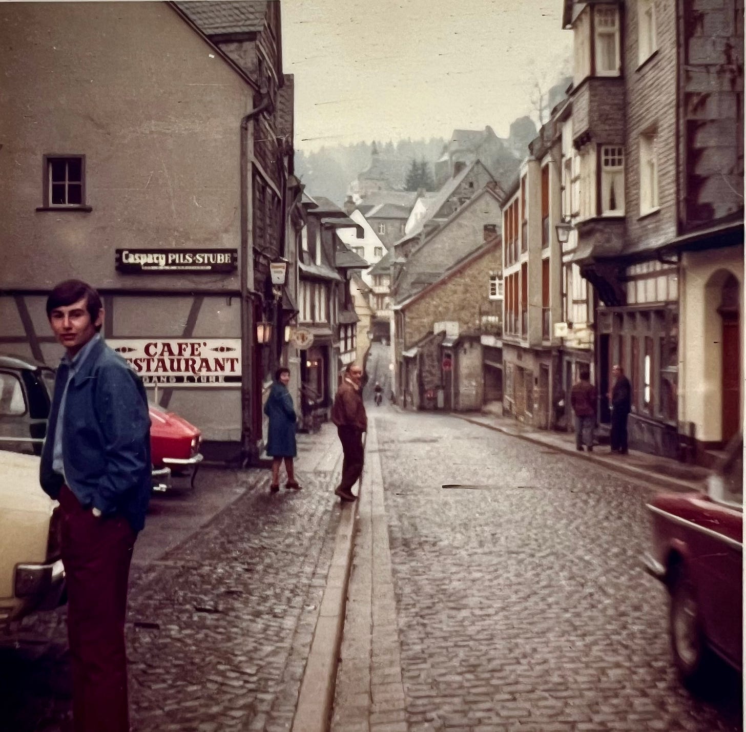 Anyway, it was a wonderful holiday, giving me a taste for travel that I’ve never lost. The old photograph of me above is from that first foreign foray and that’s my parents strolling down the straße.