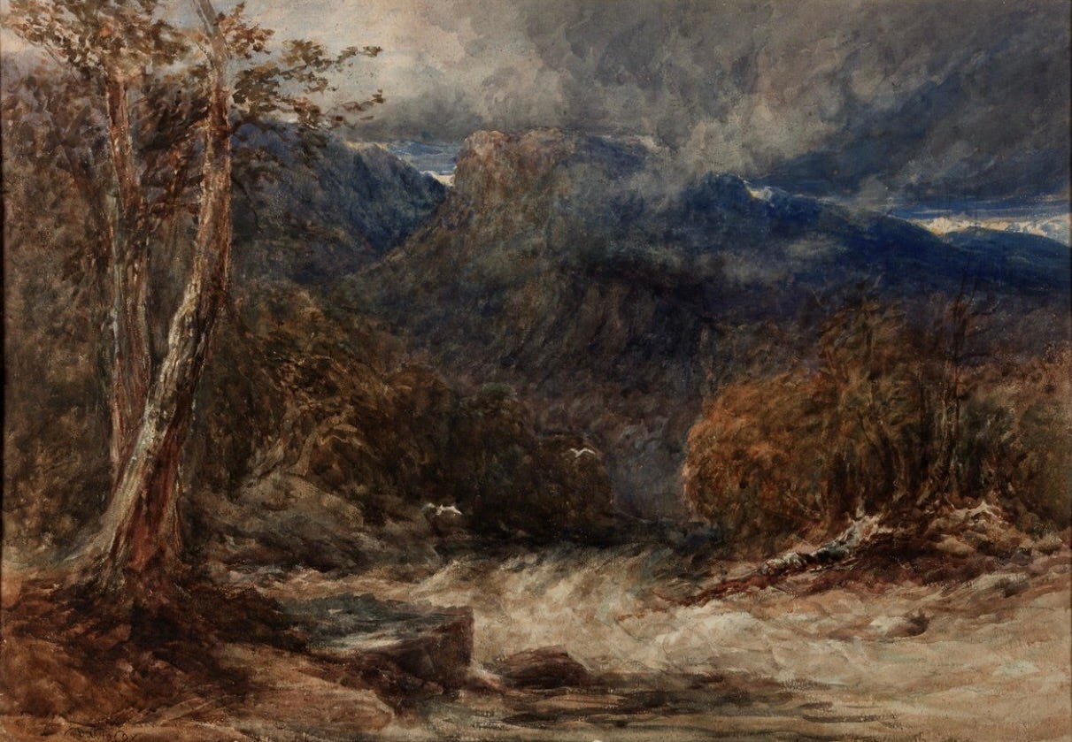 The idea of the ‘sublime’, deriving from nature’s capacity to inspire awe and wonder, first shaped British landscape painting in the eighteenth century and continues to resonate with some artists today. The concept encouraged artists to look beyond the idealised depictions of nature often found in pastoral landscapes and instead to emphasise nature’s vastness and grandeur, conveying the perception that it was beyond human control and comprehension. Some of these artists gravitated toward dramatic subjects, such as elevated mountain views and stormy seas, to elicit emotional responses in viewers, while others integrated sublime elements into more idyllic landscapes, a combined approach sometimes called the ‘picturesque.’