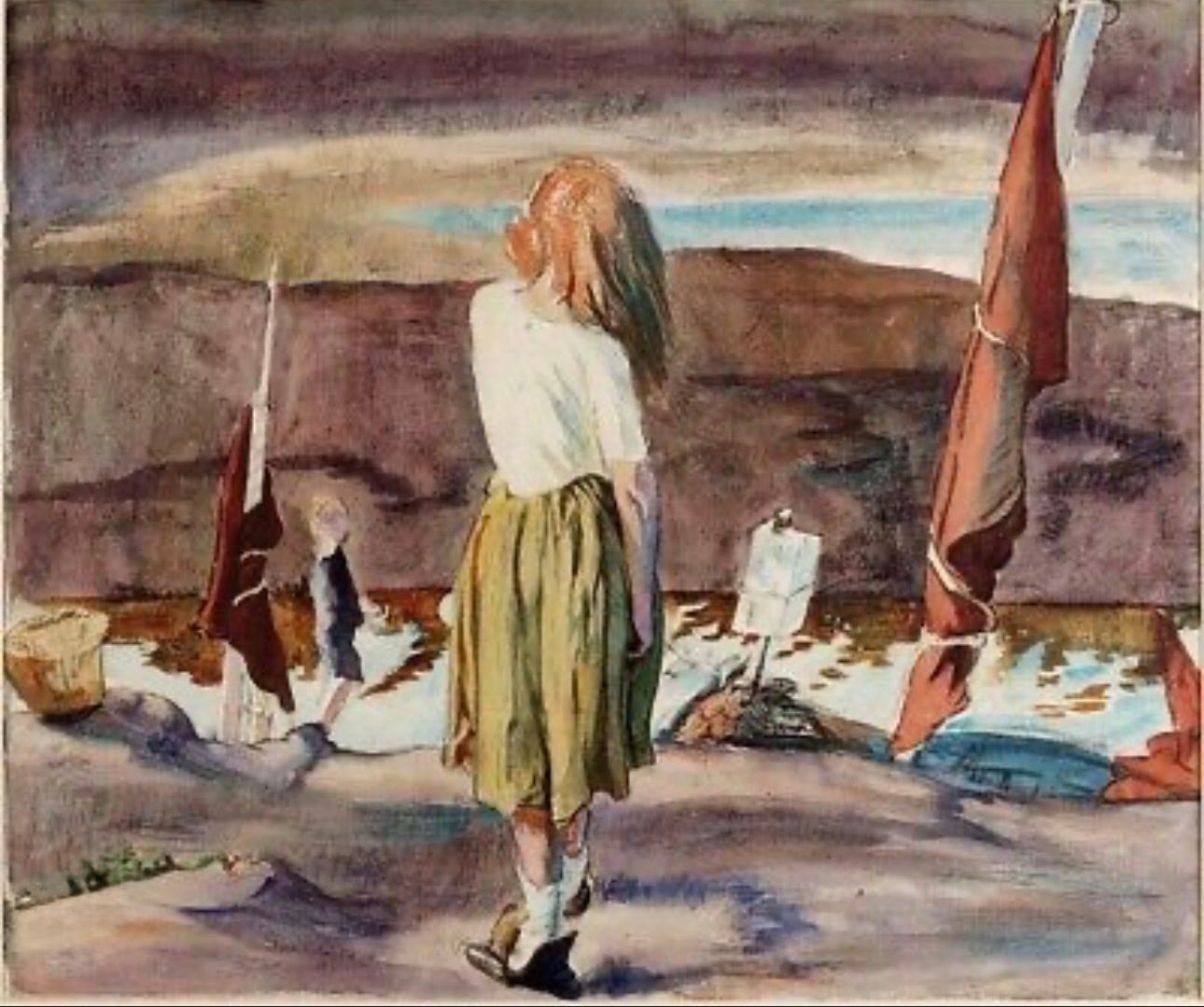 Yet another interpretation of Emily Brontë’s novel ‘Wuthering Heights’ is soon to hit cinema screens, and, by coincidence, the exhibition includes ‘Catherine’ by Lady Edna Clarke Hall. The Catherine in question is Catherine Earnshaw, the heroine of the book that fascinated Clarke Hall, and here, she depicts Catherine standing in a moorland landscape. The muted colour palette and wet-on-wet watercolour technique creating an uncertain emotional atmosphere.
