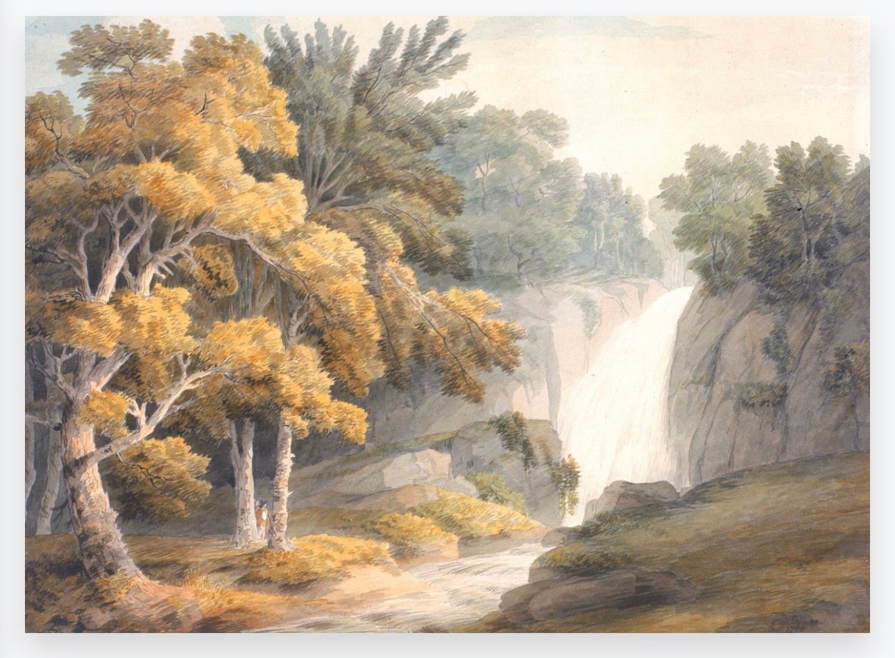 Another from that period that caught my eye was ‘A scene taken at Canonteign’ by Francis Towne, who was known for dramatic watercolours of natural features such as rugged hills, rocky terrain and tumultuous skies. Here, he captures a simpler scene of a waterfall at the country estate of Canonteign, a few miles from Exeter, where he was based. One of Towne’s contemporaries described the same view as, “noble rock towering most sublimely above the surrounding woods... I never met with a rock so compact, and of so beautiful a form, and taken in all its circumstances, so picturesque and romantic”.