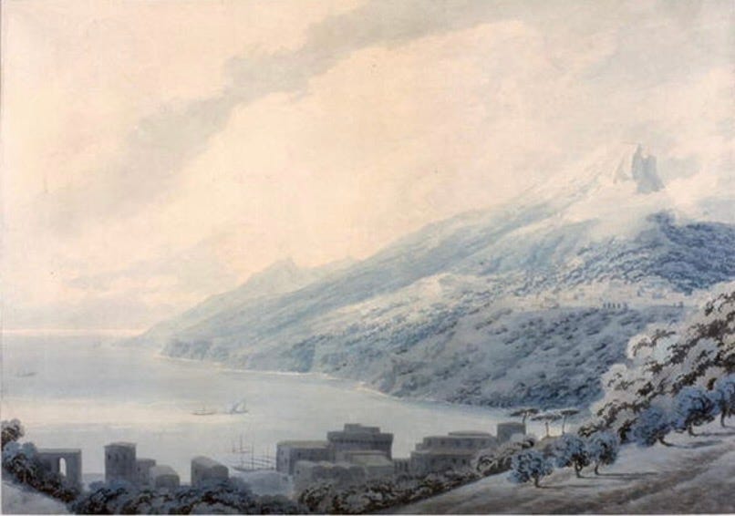 Let's turn to some of the pieces in the exhibition and of the early Romantics, one I particularly liked was John Robert Cozens’s ‘The gulf of Salerno - Raito to Vietri.’ Cozens was a pioneering Romantic watercolourist whose work helped define the sublime in British landscape painting. In the eighteenth century, many British artists toured continental Europe to experience the art and scenery of other countries. The watercolour below, from 1782, depicts the hillside village of Raito in Southern Italy and is based on a sketch made during just such a tour by Cozens. While the painting presents a calm scene, the prominence of the mountain peak on the right, partially obscured by cloud, hints at the sublime.
