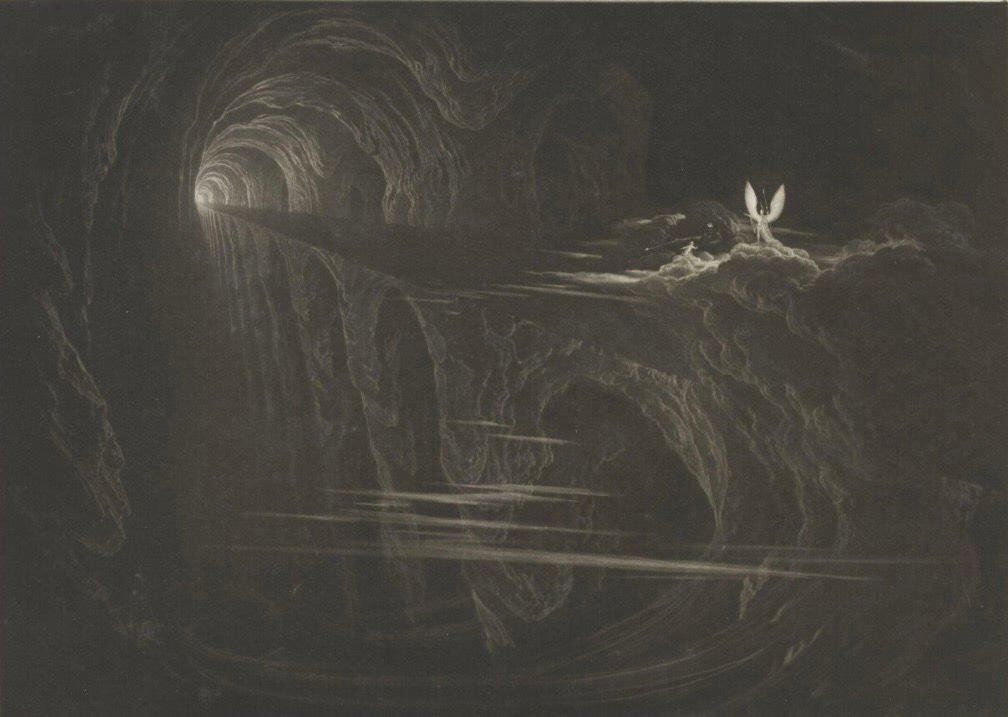 A painter with a long association with northeast England was John Martin, born in Northumberland and who began his artistic career in Newcastle as an apprentice to a coach painter. He became famous for epic, theatrical landscapes often populated with towering ruins or dramatic skies, and the Laing Art Gallery has several of his paintings in its permanent collection. However, in the case of this exhibition, one of his works on show is from the commission he received to illustrate an edition of John Milton’s 1667 poem ‘Paradise Lost’. Martin completed 24 engravings for an 1827 edition with illustrations now known for their epic quality and use of light and shadow. In ‘Bridge Over Chaos,’ Martin allowed his image to remain dominated by darkness, with the drama of distant light and the great drop below the bridge, designed to inspire awe and terror in the viewer. The illustration relates to a passage in the poem describing a new bridge across Chaos, which provided Satan with a way to pass between heaven and hell.